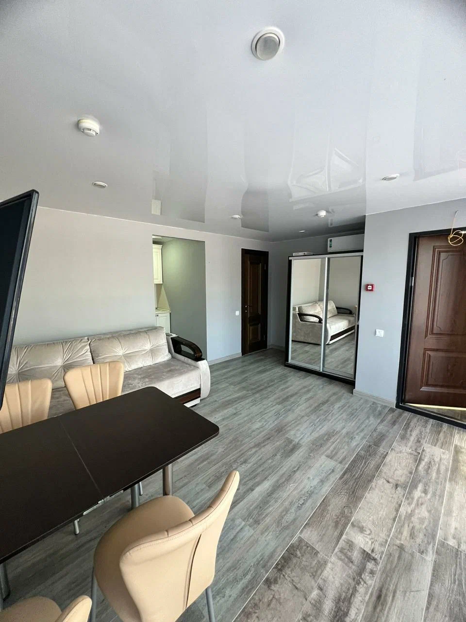 - Мебель: вешалка, диван раскладной, зеркало, кровать двуспальная, кухонная мебель, прикроватные тумбочки, стол, стулья, шкаф